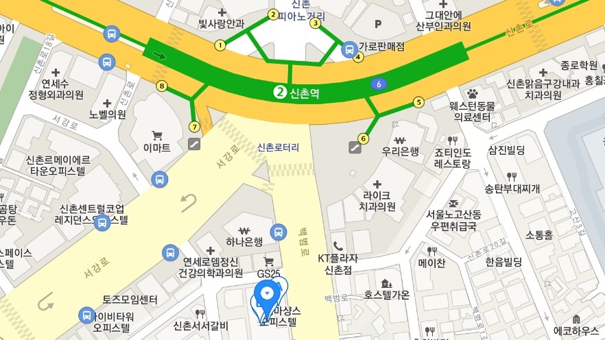 | 지하철 2호선 신촌역 6번출구 100m 1분거리 |