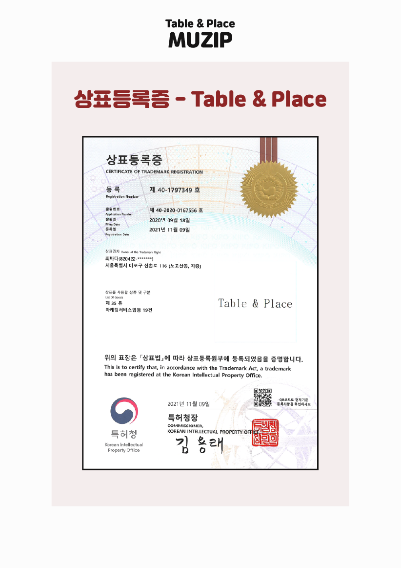 table & place(테이블앤플레이스) 상표가 등록되었습니다 :)